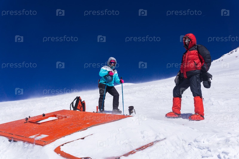 Альпинисты стоят на высоте 5000 метров над уровнем моря возле сломанного ратрака, провалившегося в ледник