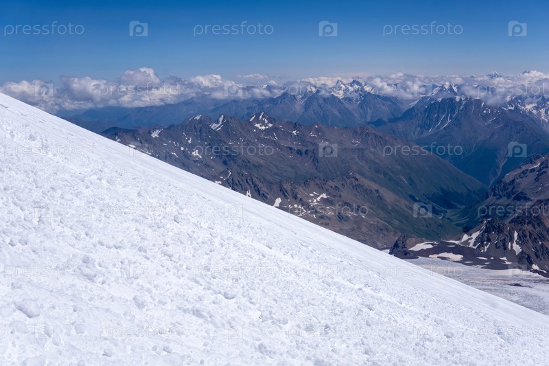 Горный пейзаж, вид с высокогорного ледникового поля на склоне на горные хребты в облаках, вид с горы Эльбрус на Главный Кавказский хребет