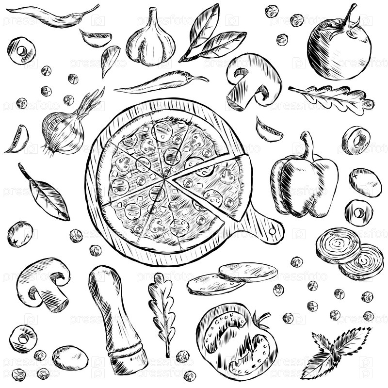 Пицца на доске в центре и все ее ингредиенты продукты вокруг