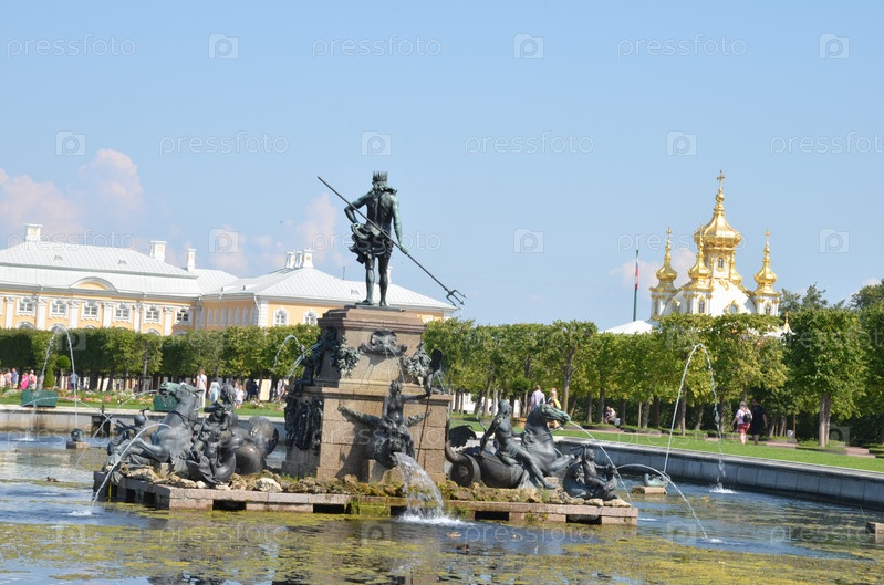 Верхний сад Государственного музея-заповедника Петергоф в Санкт-Петербурге: фонтан Нептун, вид на Большой петергофский дворец и Церковь Петра и Павла в ясный летний день