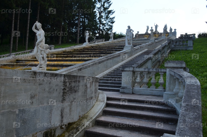 Каскад Золотая гора в Нижнем парке Государственного музея-заповедника Петергоф в Санкт-Петербурге в ясный летний день