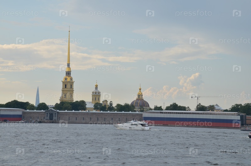 Петропавловская крепость на Заячьем острову в Санкт-Петербурге, крепостные стены украшены растяжкой в цветах флага Российской Федерации, мимо плывет белая яхта