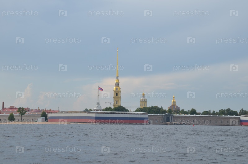 Петропавловская крепость на Заячьем острову в Санкт-Петербурге, крепостные стены украшены растяжкой в цветах флага Российской Федерации