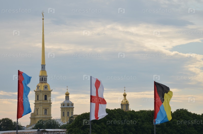 Петропавловская крепость на Заячьем острове в Санкт-Петербурге на фоне флагов украшающих Троицкий мост ко дню Военно-морского флота