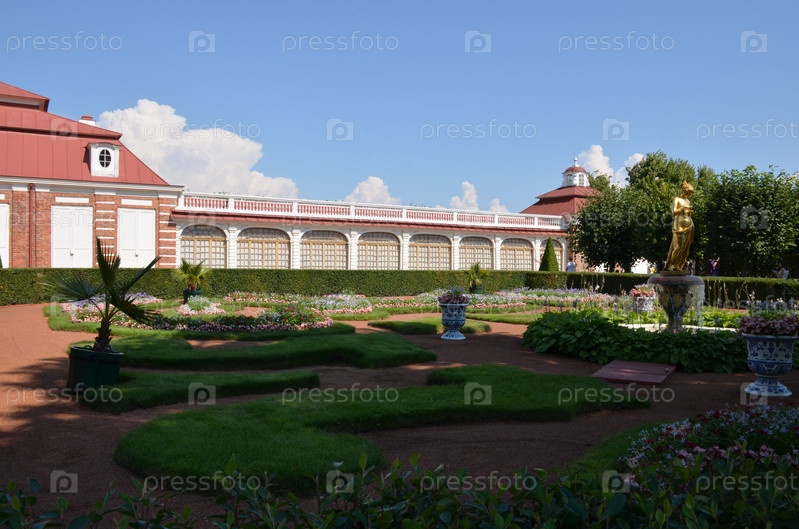 Дворец Монплезир и Монплезирский сад в Нижнем парке Государственного музея-заповедника Петергоф в Санкт-Петербурге: фонтан-колокол со статуей Психея в ясный летний день