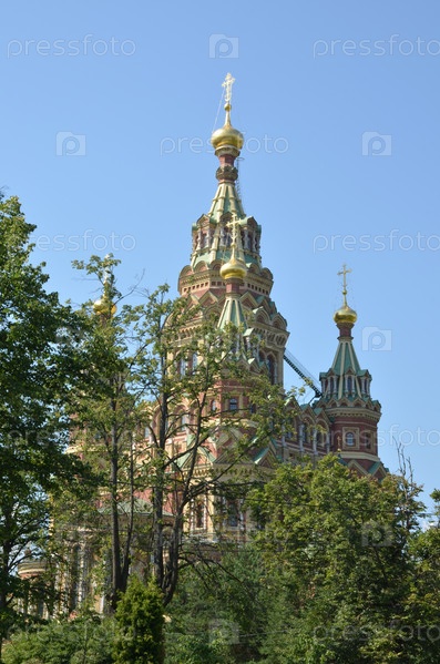 Петергофский собор святых Петра и Павла (Петропавловский собор)- православный пятиглавый храм в Новом Петергофе в Санкт-Петербурге в летний день