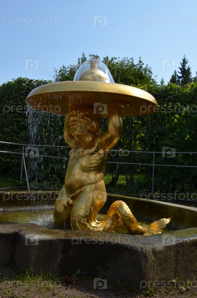 Фонтан Тритон-колокол на берегу Марлинского пруда в Нижнем парке Государственного музея-заповедника Петергоф в Санкт-Петербурге в летний день
