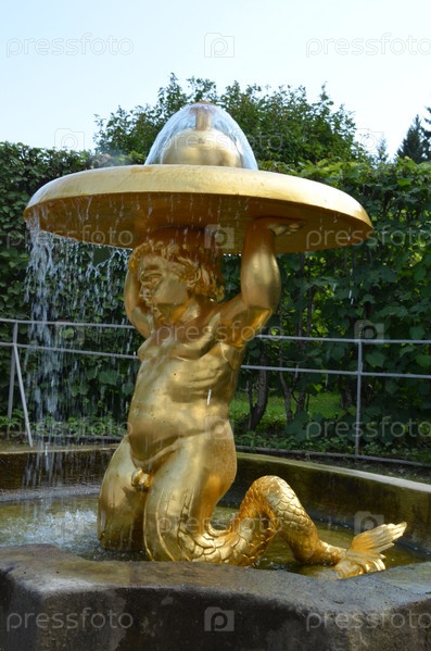 Фонтан Тритон-колокол на берегу Марлинского пруда в Нижнем парке Государственного музея-заповедника Петергоф в Санкт-Петербурге в летний день
