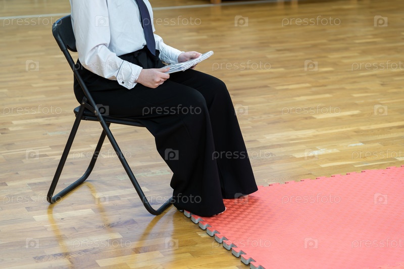 Судья по каратэ сидит возле татами с красными и белыми флажками в руках