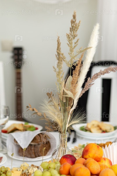 Свадебный банкет в ресторане, накрытый круглый стол для гостей, белые тарелки с фруктами и закусками