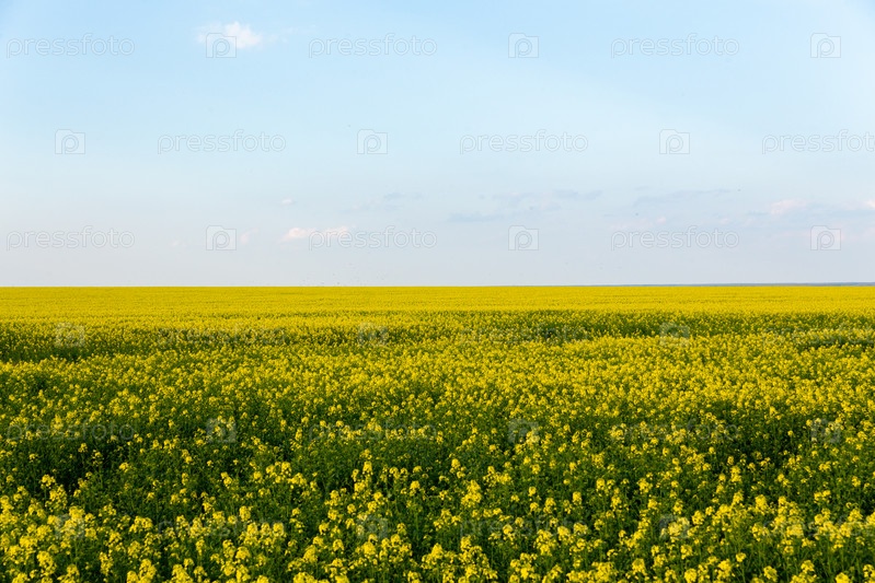Красивый панорамный вид на поле желтого рапса с голубым небом над ним. Солнечный летний день, фермерский пейзаж