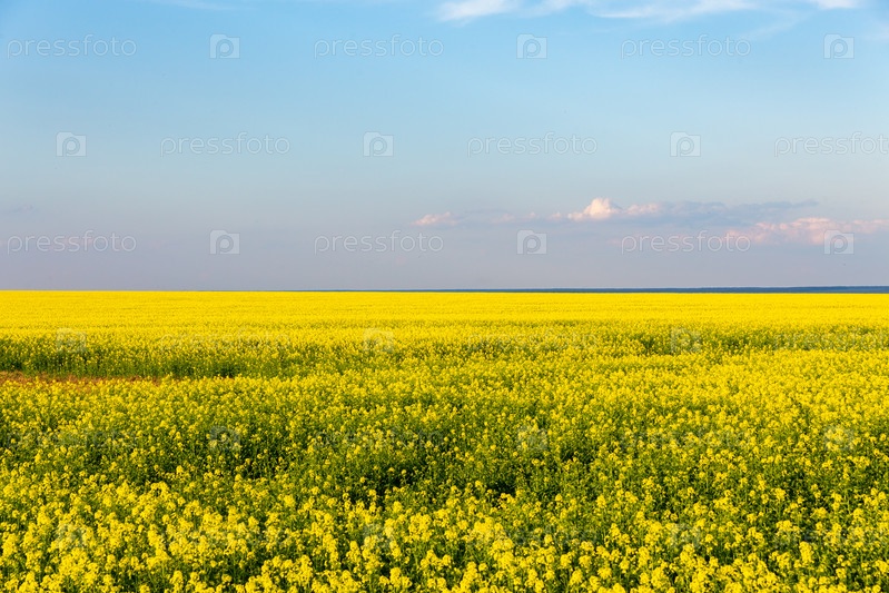 Красивый панорамный вид на поле желтого рапса с голубым небом над ним. Солнечный летний день, фермерский пейзаж
