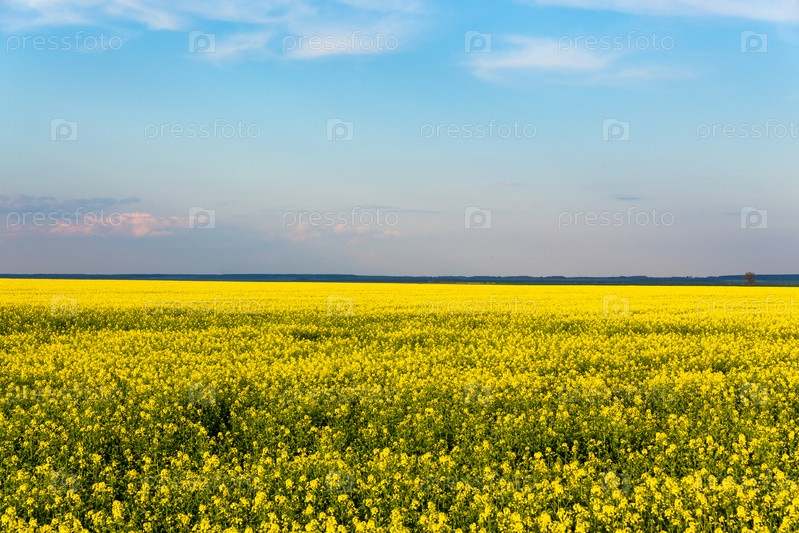 Красивый панорамный вид на поле желтого рапса с голубым небом над ним. Солнечный летний день, фермерский пейзаж