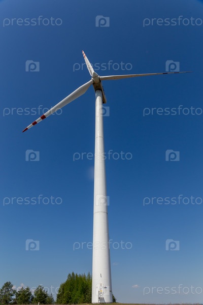 Ветровые турбины в европейском лесу. Ветряная мельница на красочном ландшафте с деревьями и полем. Зеленый баннер возобновляемой электроэнергии