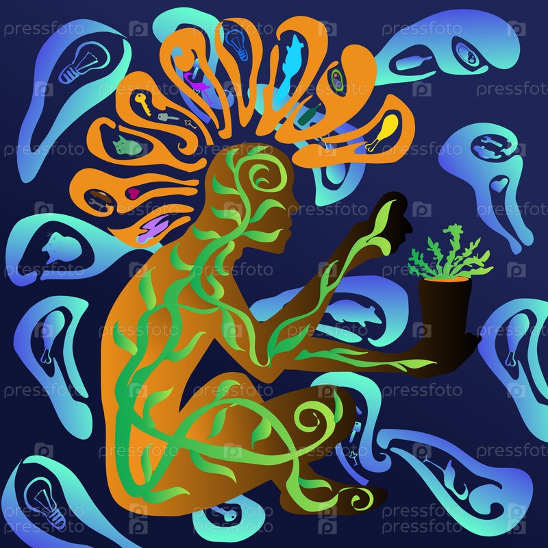 Абстрактное изображение человека с растением в горшке. Все ежедневные мысли человека остались вне головы и тела. Только покой и гармония остаются в теле во время ухода за растениями