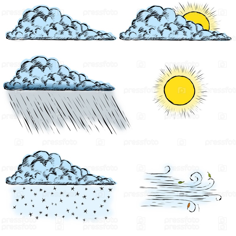 Набор облаков и погодных условий для прогноза погоды. Черный эскиз руки