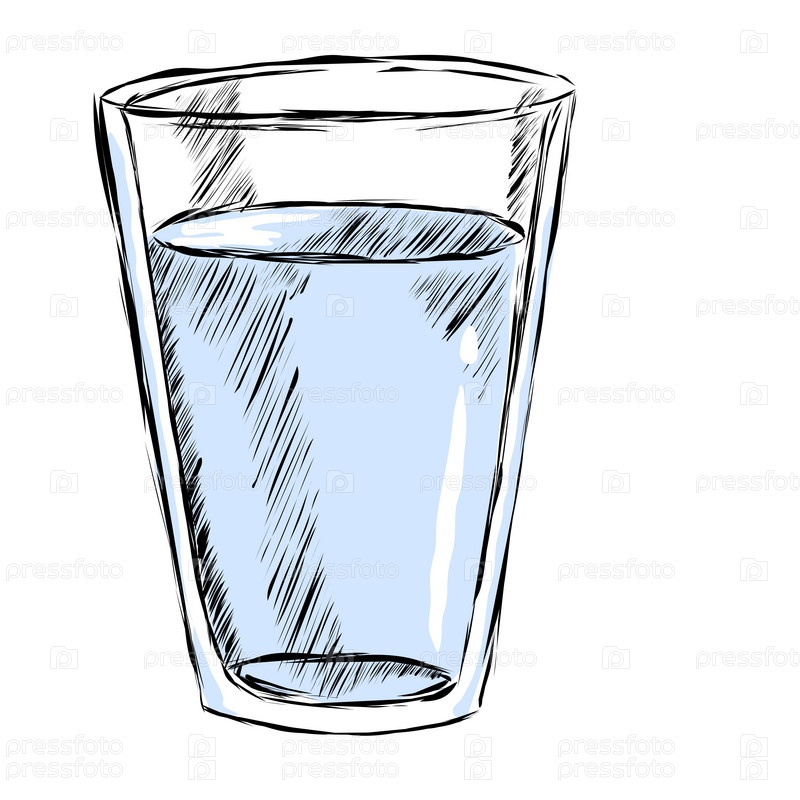 Наполненный стакан воды на прозрачном фоне. эскизный рисунок штрихом