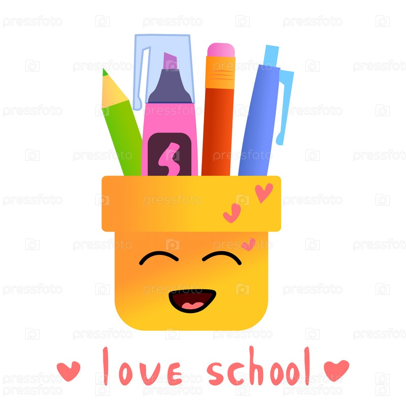 Милая улыбающаяся кавайная чашка для ручек, карандашей и других школьных принадлежностей. Векторные рисунки на тему школьных принадлежностей
