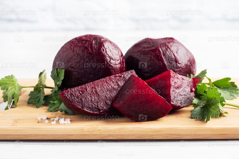 Вареная свекла целиком и нарезанная на разделочной доске с листьями петрушки на белом фоне. Копировать пространство