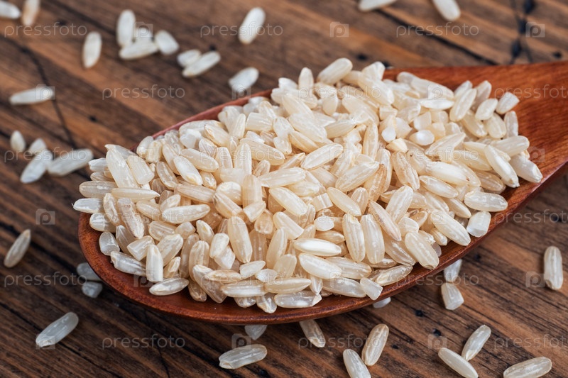 Коричневый рис сырой длиннозернистый в ложке, деревянный фон крупным планом