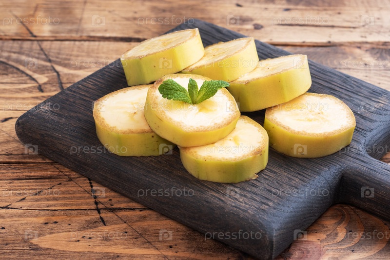 Банан и нарезанный кусочками банан с мятой на деревянном деревенском фоне