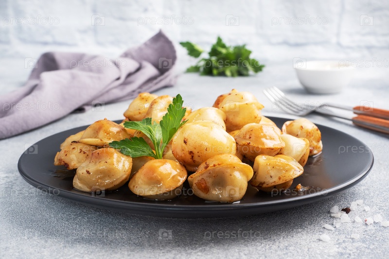 Традиционные жареные пельмени, равиоли, пельмени с мясом на черной тарелке, русская кухня. Серый бетонный фон, пространство для копирования