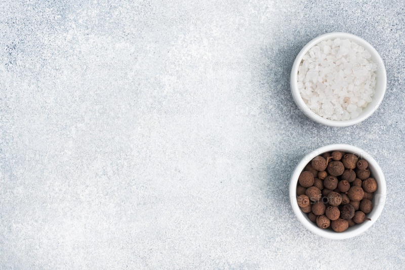 Крупная соль и черный перец горошком в белых керамических мисках на сером бетонном фоне, вид сверху с копией пространства