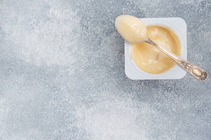 Молочный фруктовый йогурт в открытой упаковке и чайная ложка. Серый бетонный фон, пространство для копирования