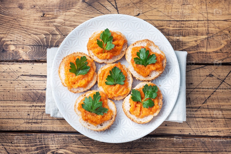 Бутерброды с хлебом цуккини икра помидоры лук. Домашняя вегетарианская еда. Консервированные тушеные овощи. деревянный фон вид сверху, копия пространства