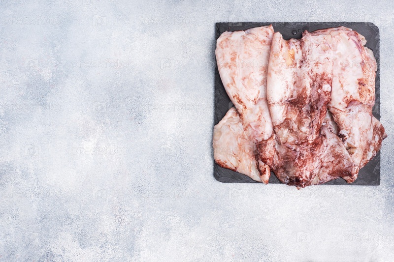 Сырая тушка кальмара со специями на черной грифельной доске. Вид сверху