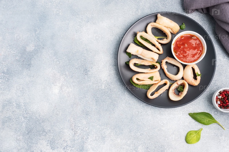 Жареные кольца кальмара с томатным соусом и лимоном. Черная тарелка, серый бетонный фон, пространство для копирования. Вид сверху