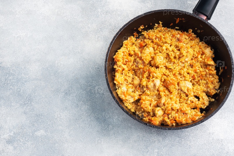 Вкусный азиатский плов, тушеный рис с овощами и курицей на сковороде. серый бетонный фон. пространство для копирования