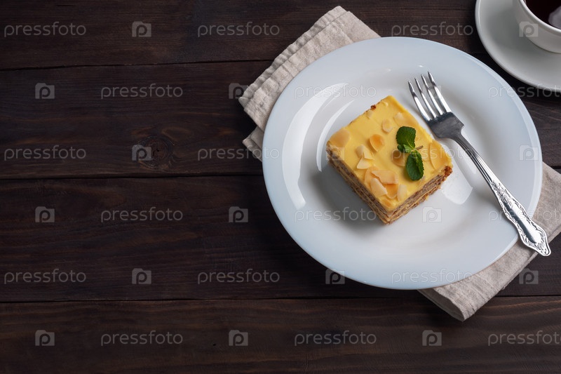 Банановый бисквит с орехами и мятой. Вкусный сладкий десерт к чаю, вид сверху, копия пространства. Темный деревянный фон