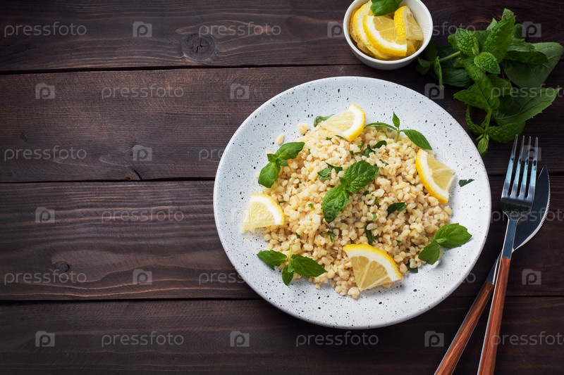 Вареный булгур со свежим лимоном и мятой на тарелке. Традиционное восточное блюдо под названием Табуле. темный деревянный фон. вид сверху, копировальное пространство