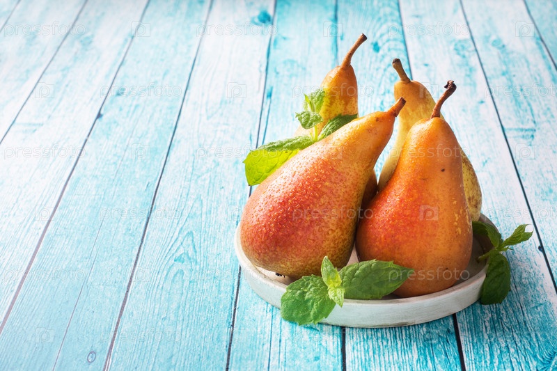 Свежие сочные груши Конференция на синем деревянном ярком фоне. Осенний урожай спелых фруктов. Копировать пространство