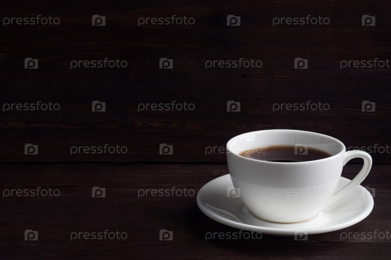 Черный крепкий кофе эспрессо в белой керамической чашке. Деревянный темный фон, пространство для копирования