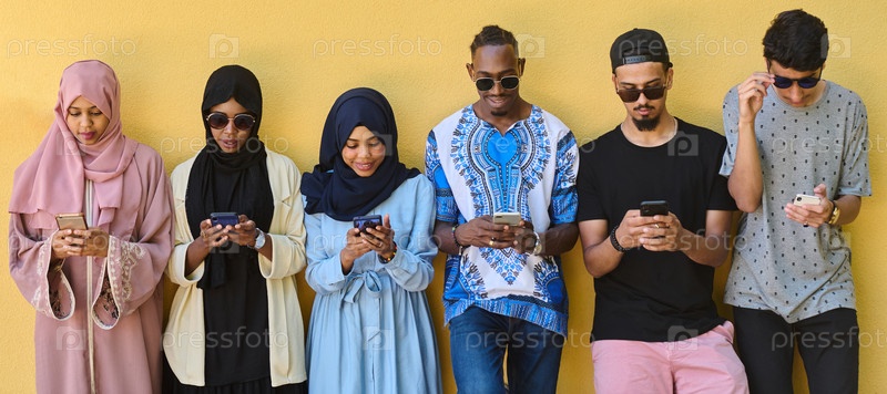 Группа подростков, стоящих вместе у стены, держащих в руках смартфоны
