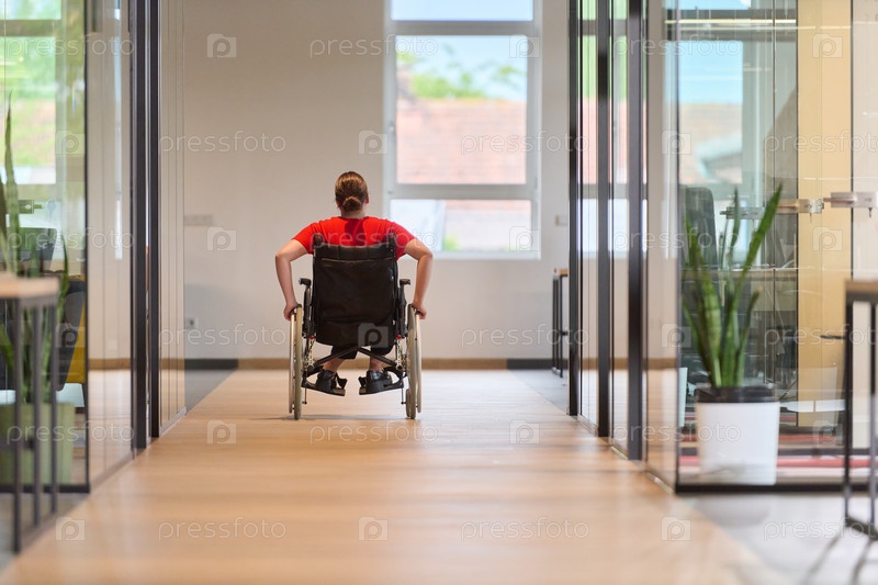 Современная молодая бизнес-леди в инвалидной коляске окружена инклюзивным рабочим пространством с офисами со стеклянными стенами, олицетворяющими решимость и инновации в деловом мире