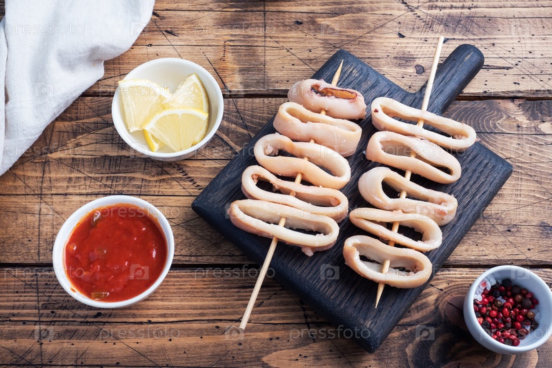 Жареные кольца кальмара на шпажке с томатным соусом и лимоном. Темный деревянный фон, копия пространства. Вид сверху