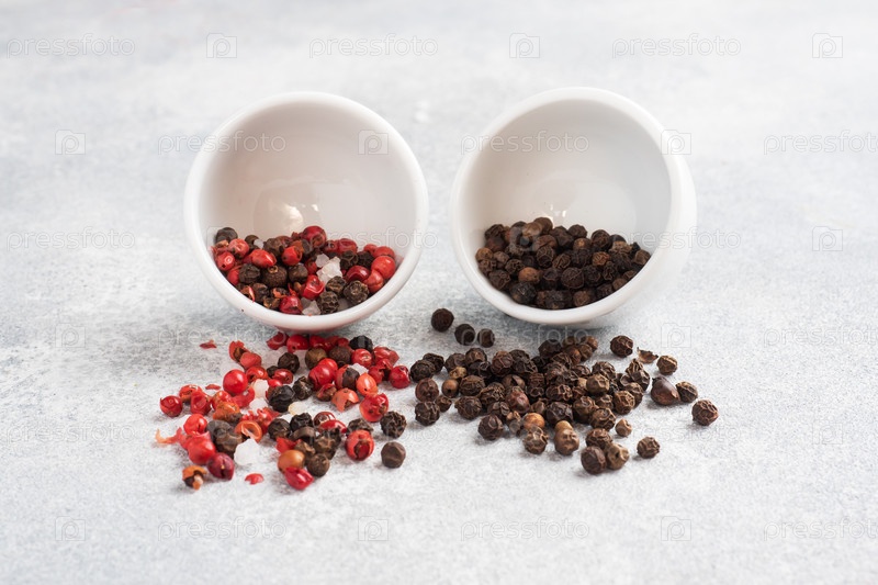 Перец горошком черный и красный в тарелках, фон серый бетон, место для копирования