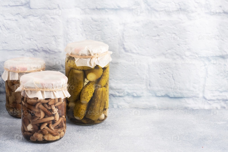 Консервирование овощей в банках. Продукты брожения. Заготовка огурцов и грибов на зиму. Копировальное пространство