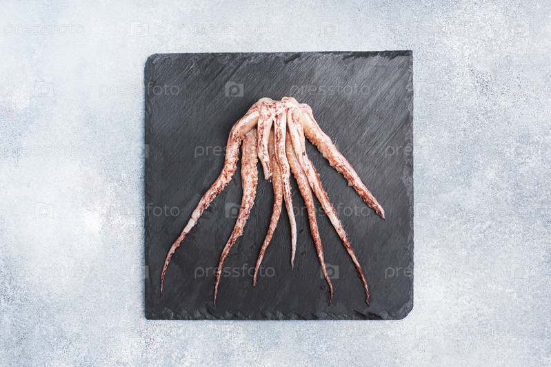 Сырые щупальца кальмара на черной грифельной доске. Копировать пространство Вид сверху. Серый фон