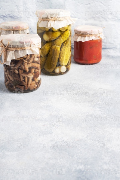 Консервирование овощей в банках. Продукты брожения. Заготовка огурцов и грибов на зиму. Копировальное пространство