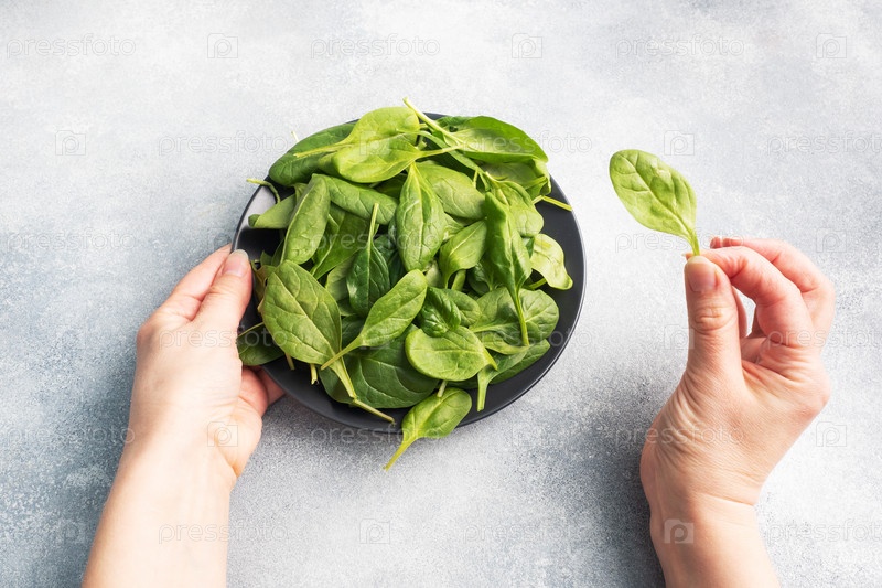 Шпинат зеленый свежие листья на черной тарелке. Женские руки держат тарелку и лист шпината в руке