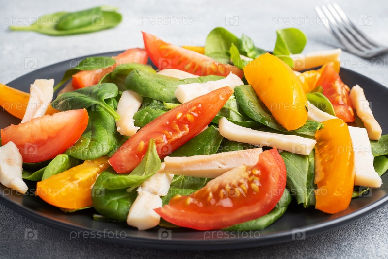 Салат из отварных кальмаров, свежих томатов, листьев шпината. Вкусное яркое диетическое блюдо с овощами и морепродуктами