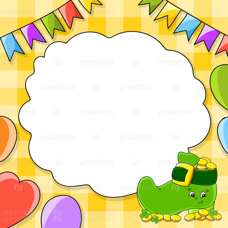 Праздничное изображение с местом для текста. Персонаж мультфильма, воздушные шары, гирлянды. Для оформления поздравительных открыток, дней рождения, наклеек. Векторная иллюстрация