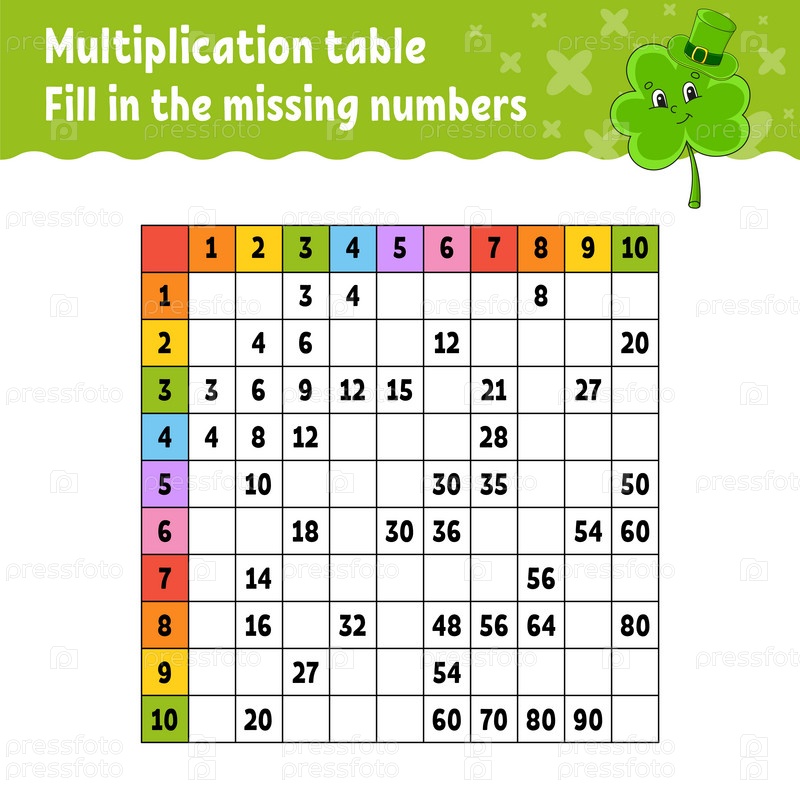 Вставьте пропущенные числа. Изучение таблицы умножения. Практика письма. Образовательный развивающий рабочий лист. Цветная страница с заданиями. Игра для детей. Изолированная векторная иллюстрация в мультяшном стиле
