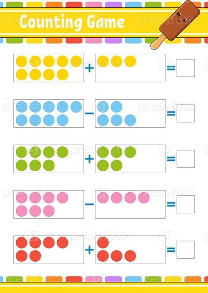 Добавление и вычитание. Задача для детей. Образовательное разрабатывающее рабочее полотно. Красочная страница активности. Игра для детей. Забавный персонаж. Изолированная векторная иллюстрация. Стиль мультфильма