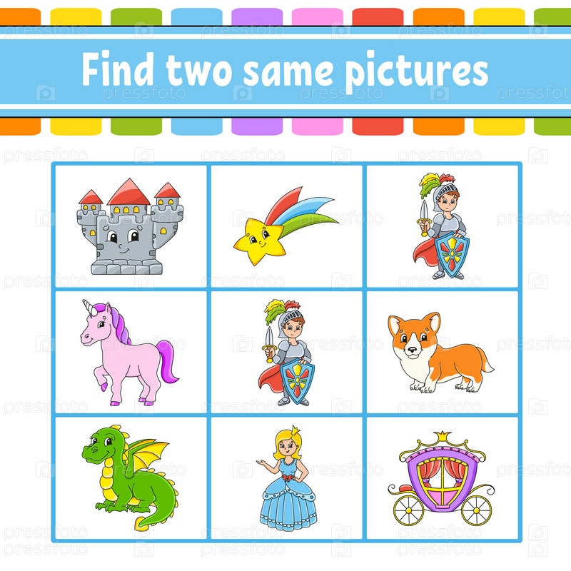 Найдите две одинаковые картинки. Задание для детей. Образовательный развивающий рабочий лист. Страница с заданиями. Цветная игра для детей. Забавный персонаж. Мультяшный стиль. Векторная иллюстрация