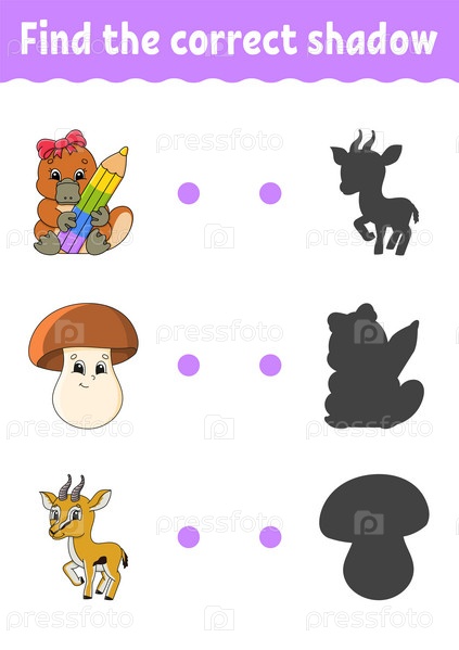 Найдите правильную тень. Образовательный развивающий рабочий лист. Игра на соответствие для детей. Страница с цветной активностью. Головоломка для детей. Милый персонаж. Векторная иллюстрация. Мультяшный стиль